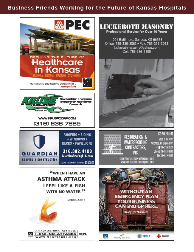 Business Friends Working for the Future of Kansas Hospitals ROOFING • SIDING • WINDOWS • DECKS • PAVILLIONS 316.302.4100 GuardianRoongLLC.com LOCAL | LICENSED | INSURED